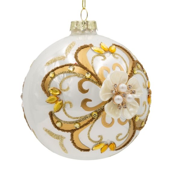 Bombka szklana zdobiona wzorem z koralików oraz kryształków kolor: biały, Skład: 100% szkło