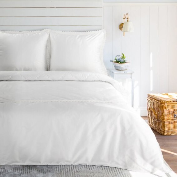 Komplet pościeli z satyny bawełnianej z koronką, pakowana w pudełku szerokość: 160 cm, długość: 200 cm, kolor: biały, Gramatura: 115 GSM, Skład: tkanina: satyna, 100% bawełna; część ozdobna (koronka): 100% poliester