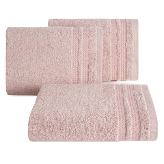 Klasyczny ręcznik kąpielowy z chłonnej tkaniny bawełnianej o splocie frotte. Minimalistyczna bordiura z weluru z dodatkiem lśniącej, metalicznej nici. szerokość: 50 cm, długość: 90 cm, kolor: pudrowy róż, Gramatura: 500 GSM, Skład: 100% bawełna; część ozdobna: 96% bawełna, 4% poliester
