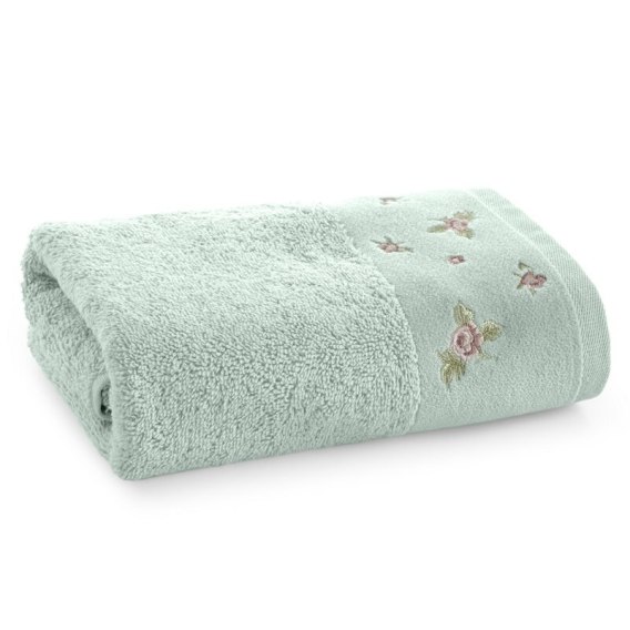 Ręcznik bawełniany z welurową bordiurą i kwiatowym haftem szerokość: 70 cm, długość: 140 cm, kolor: miętowy, Gramatura: 500 GSM, Skład: 100% bawełna