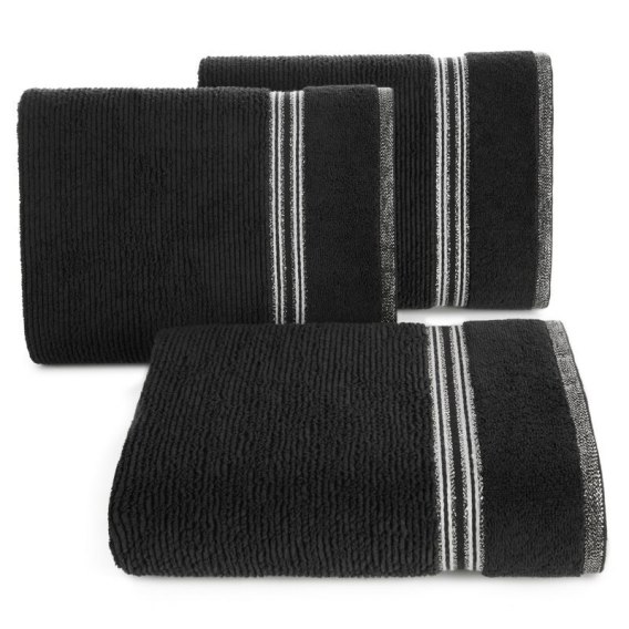 Bardzo puszysty i wyjątkowo chłonny ręcznik z bawełny frotte o strukturze delikatnych prążków. Bordiura w ciemniejszym kolorze z dodatkiem lśniącej nitki. szerokość: 50 cm, długość: 90 cm, kolor: czarny, Gramatura: 530 GSM, Skład: 100% bawełna; część ozdobna: 97% bawełna, 3% poliester