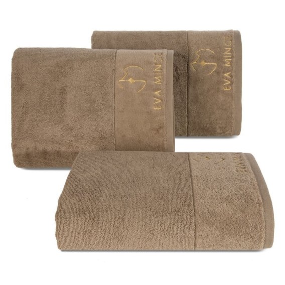 Ręcznik z welurową bordiurą zdobiony haftem szerokość: 70 cm, długość: 140 cm, kolor: beżowy, Gramatura: 550 GSM, Skład: 100% bawełna