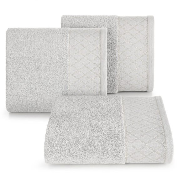 Ręcznik bawełniany z ozdobną bordiurą i błyszczącą nicią szerokość: 50 cm, długość: 90 cm, kolor: srebrny, Gramatura: 500 GSM, Skład: 100% bawełna; część ozdobna: 50% bawełna, 50% poliester