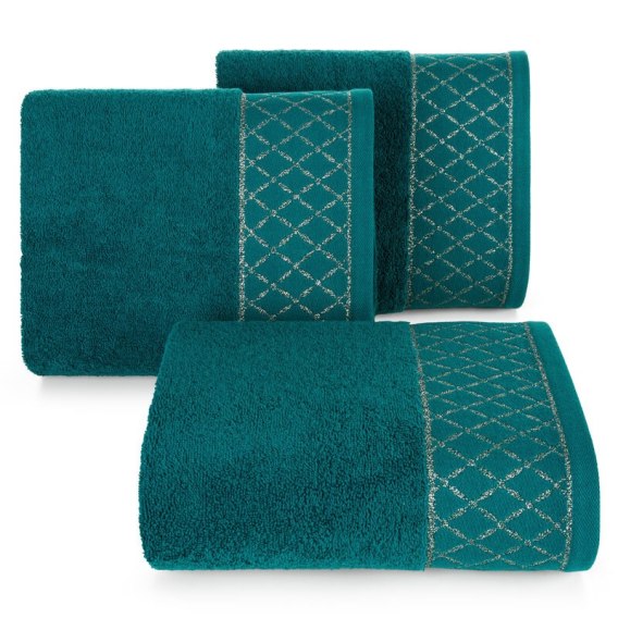 Ręcznik bawełniany z ozdobną bordiurą i błyszczącą nicią szerokość: 50 cm, długość: 90 cm, kolor: ciemnoturkusowy, Gramatura: 500 GSM, Skład: 100% bawełna; część ozdobna: 50% bawełna, 50% poliester
