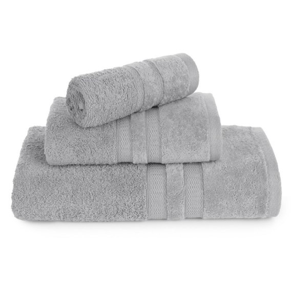 Elegancki ręcznik z delikatnej i bardzo chłonnej tkaniny frotte, jednokolorowy. Krawędzie zdobione subtelną bordiurą z welwetu. Łatwy w praniu, trwałe kolory. szerokość: 30 cm, długość: 50 cm, kolor: srebrny, Gramatura: 500 GSM, Skład: 100% bawełna