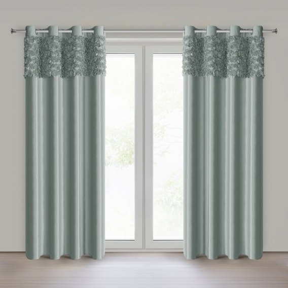 Zasłona gotowa welwetowa z 6 pasami ozdobnych róż szerokość: 140 cm, długość: 250 cm, kolor: miętowy, Gramatura: 200 GSM, Skład: 100% poliester