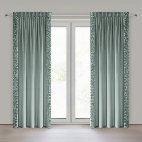 Zasłona gotowa welwetowa z pasami ozdobnych róż po bokach szerokość: 140 cm, długość: 270 cm, kolor: miętowy, Skład: 100% poliester